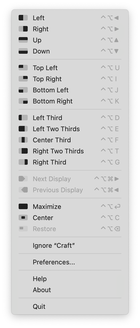 The primary benefit of the third-party apps is the sheer number of tiling options they provide. Magnet, my app of choice for this, offers over 15 built-in positions for windows, all just a click or keyboard shortcut away. Here's a look at them: