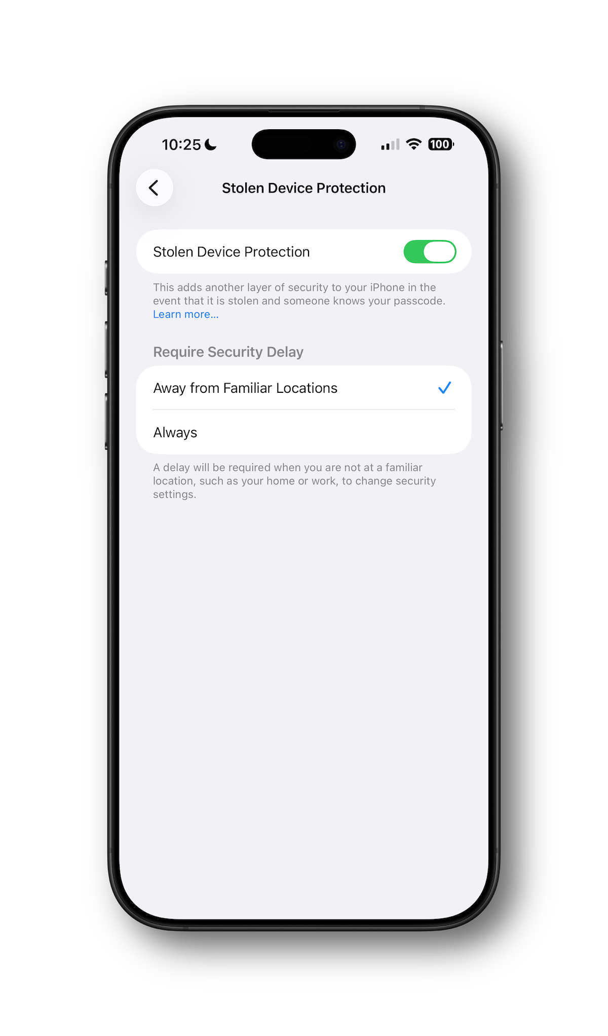 You can learn more about it in Apple's support article "About Stolen Device Protection for iPhone."
