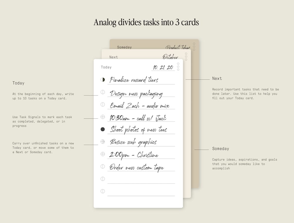 Ugmonk's Analog is a simple yet powerful tool for staying organized without the distractions of your phone or computer. And they pair wonderfully with the Ugmonk Pen that Joe mentioned.