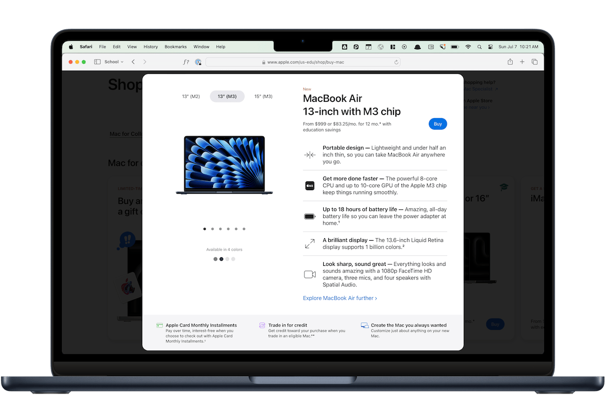 The MacBook Air is available in two display sizes, 13.6" and 15.3", and four colors: Midnight, Starlight, Space Gray, and Silver. Prices start at $999 for the M3 model in the Apple Education Store, and Apple's current Back to School promo will get you a solid $150 back as an Apple Gift Card.