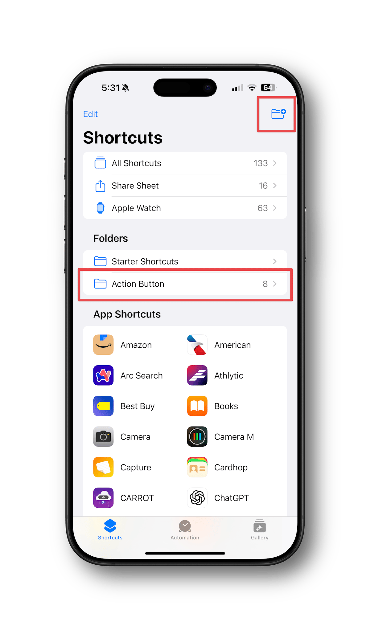 On the Shortcuts home screen, tap the folder icon in the top-right to create a new folder.