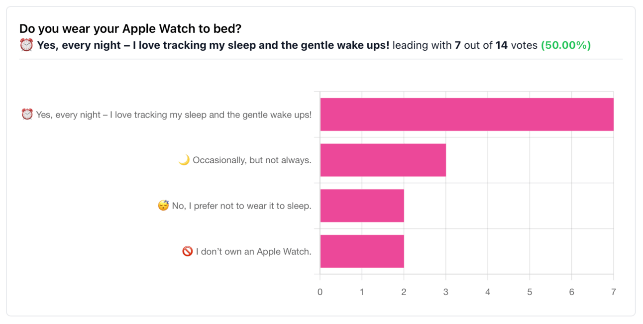 Here are the poll results from the last newsletter, where I asked if you wear Apple Watch to bed. Half of you who voted said yes, every night!
